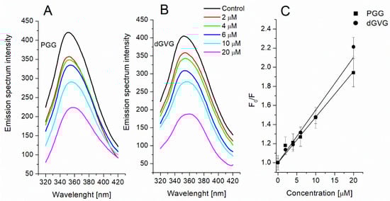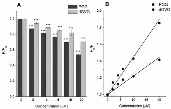 where: F0 and F are DPH fluorescence without and in the presence of PGG/dGVG; KSV is the Stern–Volmer constant; and [Q] is the concentration of the quencher (PGG or dGVG, respectively).