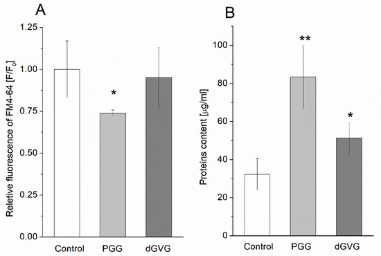 We also evaluated the changes in the content of lipids and proteins under the influence of PGG and dGVG in isolated staphylococcal MVs. The results are demonstrated in Figure 9. It was observed that the relative quantity of lipids was reduced in the presence of PGG to 0.74 ± 0.02 in comparison to the control (1.00 ± 0.17) in a statistically significant manner (p = 0.029). For dGVG, only a slight and statistically insignificant decrease in lipids content was observed. The quantity of proteins in the vesicles isolated from bacteria increased to 83.34 ± 16.51 μg/mL (p = 0.008) and 51.34 ± 8.08 μg/mL (p = 0.037) for PGG and dGVG, respectively, if compared to the control (32.34 ± 8.33 μg/mL). In this case, there is also a clear correlation between the molecular structure of tannins, their membrane effects, and the influence on the vacuolization process and the composition of vesicles. PGG caused the strongest changes in the lipid and protein content of the vesicles.