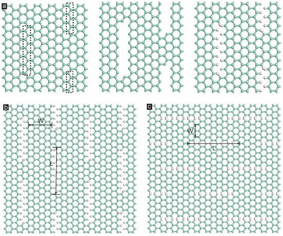 The setup of the hydrogenated GK with both zigzag and armchair incisions is illustrated in Figure 1. During the model construction process, two horizontal columns of carbon atoms in the dotted pane on the graphene sheet with a periodical boundary were removed to create incisions, as exhibited in Figure 1a. Afterwards, the hydrogen atoms were supplemented at the broken bonds, establishing the GK unit. After that, the GK unit was supercell with the size of 51.12 × 49.2 Å2 with the periodical boundary. The models of the generated GK with zigzag and armchair incisions are presented in Figure 1b,c, respectively. The DD of the GK can be tuned by two parameters named the incision length (L) and the width among incisions (W), as shown in Figure 1b,c. The simulated GK with different incision lengths and the width among incisions in both zigzag (ZZ) and armchair (AC) incisions are listed in Table 1. The DD of the GK is defined according to previous literature [,], equaling the ratio of the removed carbon atoms to the total atoms on the entire graphene sheet.