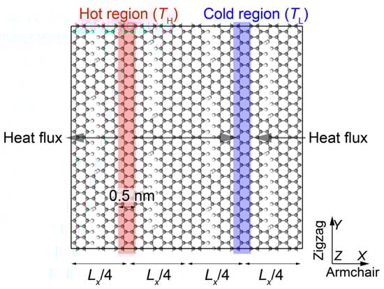 Following the methodology discussed in previous studies [,,,,], we adopted nonequilibrium molecular dynamics (NEMD) simulations to study the thermal response of the built GK. As is shown in Figure 2, two regions with the width of 0.5 nm and centered at and were placed in Langevin thermostats [] with a high temperature () and a low temperature (), which resulted in a temperature gradient and heat flux along the direction. The heat flux was calculated by following a previous study [,]. The thermal conductivity was thus calculated from Fourier’s law for heat conduction . The reactive empirical bond order (REBO) potential [] was used to describe the interatomic interactions in GK with a timestep of 1 fs, which has proved to accurately predict the thermal response of graphene-based membranes (e.g., [,]). Periodic boundary conditions were applied in all directions. The NEMD simulation was performed by following the following procedure: first, the GK experiences an energy minimization using a steepest descent integrator. Second, a relaxation run for the whole system in ensemble with the temperature of lasting 1 ns is performed. Third, the two predefined thermostats are switched on and an equilibrium run of 1 ns is performed to obtain the steady state, where the regions between the two thermostats are in ensemble, and the two thermally-bathed GK ribbons are in ensemble, i.e., an ensemble together with a Langevin thermostat. Finally, a production run lasting 1 ns is performed to collect the thermodynamic data and temperature distribution profiles. The GK models are divided into 70 bins along the directions to collect the data. Note that the measured thermal conductivity is under a vacuum environment. If the studied GK is immersed in the environment of solvent molecules, the nearby solvent molecules of the GK layers will act as an additional heat transfer media and fill in the defects of GK layers. Therefore, the thermal conductivity will be increased. However, if it is an aqueous environment, as the thermal conductivity of water is much lower, the increment will be trivial.