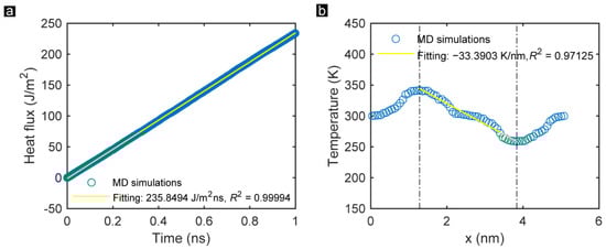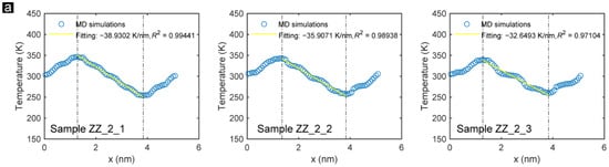 The thermal conductivity of the stretched armchair-incised GK demonstrates similar characteristics. As presented in Figure 8, the fitting coefficient of the temperature gradient tends to drop first and then grow up. The difference between the steep and gentle stages is most significant at 15% stretching strain. According to previous literature [], the ultimate tensile strain of the zigzag-incised and armchair-incised GK could reach 40% and 35% respectively. Hence, in this work, we employed Sample ZZ_1_1_25% and Sample AC_3_1_15% for thermal conductivity simulation to ensure that the C–C bonds on GK do not fracture and keep stable during heat transfer.