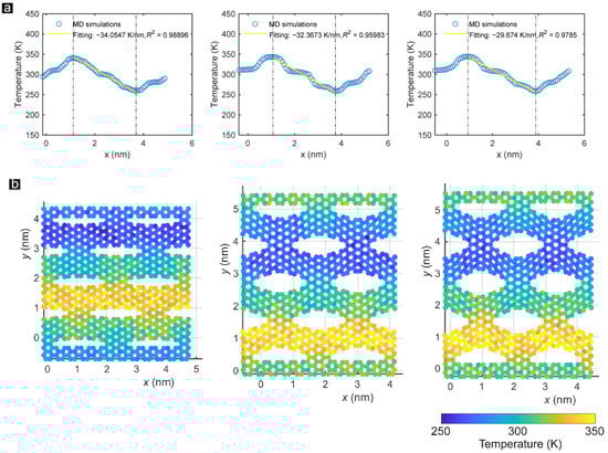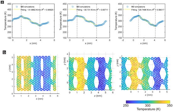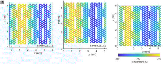 By virtue of superior adjustability and the advantages of graphene-based nanosheets as monolayer membranes, the GK structure can tune its thermal conductivity through stretching, which the previously reported NPG cannot []. Figure 7 presents the time-averaged temperature distributions and corresponding snapshots of the temperature color maps along the direction perpendicular to the zigzag-incised GK incisions under 5%, 15%, and 25% strain. With stretching, the heat transfer fluctuates more than the unstretched state under low strain. The increasing strain makes the difference between steep and gentle stages more obvious. The shape of the temperature profile in Figure 7a is determined by the structural characteristics of GK layers after stretching. The stretching process will lead to the generations and disappearances of wrinkles on GK layers [], which will affect the heat transport path of the GK layers. The smaller fitting coefficient value indicates the less-uniform distributions of pores and deformations. Therefore, the temperature gradient fitting coefficient of Sample ZZ_1_1_15% is lower than the other two in Figure 7a because of its less-uniform distributions of pores and deformations at this strain value. The color map of temperature distribution proves this view. As shown for Sample ZZ_1_1_5% in Figure 7b, the temperature difference between some carbon atoms and the surrounding carbon atoms is significant, indicating that these carbon atoms are not on the primary heat conduction path of the GK and contribute little to thermal conduction. Nevertheless, with the increase of tensile strain, the GK produces greater deformations and generates wrinkles to guide thermal conduction. Therefore, the thermal conductivity becomes uniform for Sample ZZ_1_1_25%.
