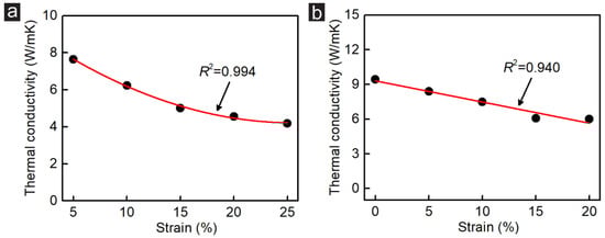 The relationship between the strain rate and the thermal conductivity on both zigzag-incised and armchair-incised GK was calculated and is shown in Figure 9. Two different fittings occur on the GK with different incision directions. A high quadratic function fitting with a 0.994 fitting coefficient was obtained for Sample ZZ_1_1 with the stretching strain between 5% to 25%. The change rate of thermal conductivity is about 0.17 W/mK with 1% stretching strain. The change rate of thermal conductivity can be further reduced at high tensile strain rates, achieving approximately 0.076 W/mK with 1% stretching strain between 20% and 25%. For the armchair-incised GK (Sample AC_3_1), the change rate of thermal conductivity is about 0.18 W/mK with 1% stretching strain, which is slightly lower than that of the zigzag-incised GK. However, the thermal conductivity drops linearly with the strain, meaning it is more controllable. Overall, the fitting results in shown Figure 9 prove that the thermal conductivity can be precisely regulated by strain.