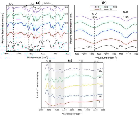 Detailed FTIR spectra of the synthesized MMMs is shown in Figure 5. The characteristic bands of silica and PES matrix are observed and labeled accordingly in Figure 5a. There is no difference in the spectra of MMMs in the fingerprint region as can be seen Figure 5a. This implies that PES is chemically unaffected by incorporating modified silica nanoparticles. However, a remarkable spectral shift in ether linkage (C–O) and sulfone group (S=O) is observed after the incorporation of modified silica nanoparticles in the PES matrix, as shown in Figure 5b where the spectra of ether linkage and sulfone groups are enlarged. The ether link band shifted from 1244 cm−1 for pure PES membrane to 1230 cm−1 for MMMs. Similarly, the sulfone peak shifted from 1158 cm−1 for pure PES membrane to 1145 cm−1 for MMMs. These spectral shifts towards lower wavelength indicate the presence of strong interaction such as hydrogen bonding between the two phases at the molecular level [21,22,23,24]. The functionalization of silica nanoparticles with silane coupling agent is confirmed by the presence of two amine bands (N–H) at 3500–3300 cm−1 since the silane coupling agent contains (N–H) group in its structure, as shown in Figure 5c [20,25]. In addition, silanol groups (Si–OH) are also observed at 3640 cm−1 due to their natural occurrence on silica surfaces [26,27]. The presence of (N–H) and (Si–OH) groups in modified silica nanoparticles interacted with the PES matrix, causing a spectral shift in sulfone and ether link bands.
