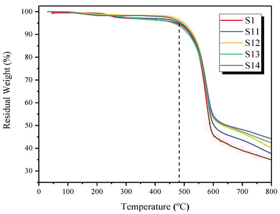 Figure 6 displays the TGA thermograms of the pure PES membrane and the synthesized MMMs with modified silica nanoparticles. The thermogram of all the membranes shows that there is no significant residual solvent or moisture in the MMMs, indicating solvent’s complete evaporation during the membrane drying process. The degradation onset temperature of MMMs is slightly higher than PES membrane (473.5 °C). For example, degradation onset temperature for S11, S12, S13, and S14 membranes containing 2%, 4%, 6%, and 8% of modified silica is found to be 482.1 °C, 499.37 °C, 503.13 °C and 507.21 °C, respectively. While this degradation onset temperature for the PES membrane was found to be 473.05 °C. Thus, it is obvious that the incorporation of modified silica nanoparticles has enhanced the thermal stability of the membranes and delayed the degradation process [28]. Moreover, in the thermal decomposition range of 470–600 °C, more residual weight is observed for MMMs, indicating the incorporation of silica particles in the PES matrix. Thus, at 600 °C, S11, S12, S13, and S14 membranes containing 2%, 4%, 6% and 8% of modified silica has shown 50.60%, 52.03%, 53.46% and 54.51% residual weight, respectively. Similar improvements in the thermal stability of MMMs by incorporating fillers are reported in the literature [29].