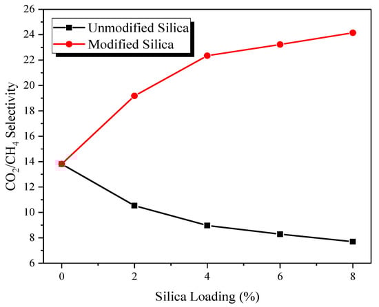 Nevertheless, the permeability of CO2 is greater than CH4 gas for all loadings of silica. This is due to the smaller CO2 molecules penetrating faster than bigger CH4 molecules in the membrane matrix. Thus, the sieving ability of the membrane is retained at various silica loadings. Another factor contributing to the higher permeability of CO2 gas compared to pure PES membrane is the presence of functional groups at the filler surface, such as hydroxyl groups and amine groups resulting from silane modification of filler [18]. These groups tend to interact with polar gases such as CO2 instead of non-polar gas, i.e., CH4. Thus, a slightly higher solubility is expected in amine-modified silica-filled MMMs compared to pure PES membrane. Therefore, higher CO2 permeability is observed with the increase in silica loading. In the case of CH4, the permeability increase is attributed to interfacial volumes at the polymer-filler interface. The third factor, besides the interfacial morphology and the presence of amine functional groups, is the disruption of the polymer chain packing and creation of excess free volume in the membrane structure due to the incorporation of filler, as it was reported for unmodified silica-filled MMMs [37]. This observation is supported by XRD pattern of the synthesized MMMs shown in Figure S2 where 2θ is slightly shifted from 18.10° to 17.42° showing an increase in the amorphous structure of the PES matrix [38]. This free volume provides an additional pathway for gas diffusion in inorganic-filled MMMs. The change in the solubility coefficient of MMMs is negligible at lower filler loadings [20]. Therefore, the enhancement in permeability is mainly due to a rise in the diffusion coefficient induced by the creation of excess free volume in the membrane matrix.