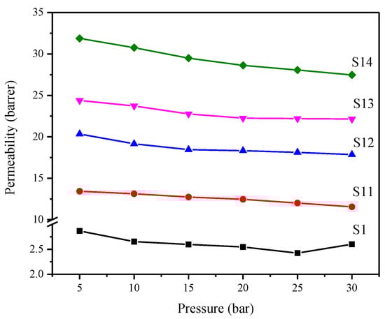 For MMMs with modified silica nanoparticles, the maximum permeability is recorded at the lowest pressure, i.e., 5 bar and the minimum permeability is observed at the highest tested pressure, i.e., 30 bar. However, the trend is different for pure PES membrane and MMMs. In pure PES membrane, the plasticization phenomenon is observed after 25 bar feed pressure. The reported plasticization pressure of PES is 28 bar for CO2 gas [44]. As the pressure is further raised, more CO2 gas is sorbed into the polymer matrix, causing polymer chains to relax and increase chain mobility. The combined effect of increased chain mobility and swelling of the polymer matrix causes an increase in the diffusion of gas molecules by lowering the activation energy required for permeation. Because of this phenomenon, the ability of membranes to discriminate between gases based on molecular size is significantly reduced, lowering the selectivity [43,45].