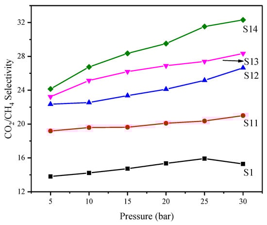 The ideal selectivity of MMMs is shown in Figure 10 in the pressure range of 5–30 bar. The ideal selectivity of the synthesized MMMs increases with feed pressure, a reported trend in glassy polymers. Due to a reduction in the permeability of MMMs at high pressures resulting from compaction of the matrix, the size sieving ability of the MMMs is improved, which imparts selectivity to MMMs. All MMMs displayed maximum selectivities at the maximum operating pressure of 30 bar. The maximum selectivity of 32.31 is observed at 30 bar for MMM with maximum silica loading, i.e., 8%. Thus, MMMs were able to maintain permeability as well as selectivity within the study’s pressure range. These results indicate that PES/modified silica filled MMMs have a great potential in CO2/CH4 separation at elevated pressures.