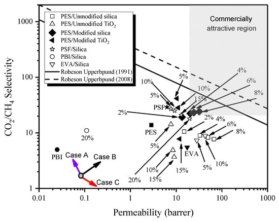 The increase in the permeability of MMMs is attributed to the creation of excess free volume in the membrane by disrupting the polymer chain packing and attachment of active functional groups on the filler surface, which have an affinity with target gas, i.e., CO2. The improvement in the selectivity of MMMs is attributed to the elimination of interfacial defects. Moreover, PES/modified silica MMMs fall in the commercially attractive region, as displayed by the grey area in the upper bound curve [48]. Therefore, PES/modified silica MMMs have emerged as a potential candidate for application in natural gas processing applications.