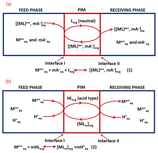 The basic components of polymer inclusion membranes are a polymer that ensures the mechanical strength of the membrane and a carrier that is responsible for removing desired species, i.e., metal ions from the aqueous solution, and transporting them into the membrane structure. The structure and properties of the carrier are essential, as they influence the mechanism of the extraction process (chelation or ion exchange) and affect selective membrane permeability. The formed ion pair or the complex (analyte and carrier) can diffuse through the membrane, and then, using a properly selected receiving phase, metal ions are released and the carrier is able to repeat the transport process [20,24,31]. Depending on the type of carrier, transport of metal ions is subject to a facilitated co-transport (chelating-type carrier) and counter transport (acid-type carrier) [32]. Figure 1 shows simplified processes of facilitated co-transport and counter transport of metal ions Mm+ through PIMs containing different types of carriers. In the case of co-transport (1a), associated ion pairs Mm+ and mA− (A—anions) contained in the feed phase are extracted, reversible by the neutral carrier L (component of the PIM). The processes taking place at the feed phase/membrane and membrane/receiving phase interfaces can be described by the Equation (1), and the metal cations and anions migrate in the same direction to the receiving phase. In the case of counter transport, when the carrier contained in the PIM is acid-type, the process is based on a cation exchange proton mechanism: cations migrate in the opposite direction to protons (from high pH to low pH solutions), and the equilibrium at the feed face/membrane interface can be described by Equation (2) ([33] and references therein).