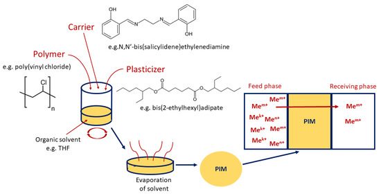 In addition, during the formulation of PIMs, plasticizers which influence the physical and chemical properties of the membranes (i.e., improve their flexibility and affect the efficiency of the metal ions’ transport process) can be added. It has been shown that some carriers can also act as plasticizers [25]. Usually, PIMs are prepared by a solvent casting method, shown in Figure 2 (dissolving the membrane components in an organic solvent, e.g., THF, after thorough mixing, then pouring the solution on a self-levelling dish and evaporating the solvent); however, in the case of PIMs containing an ionic liquid as a carrier, it is possible to apply solvent-free procedures, for example based on a thermal compression technique [34].
