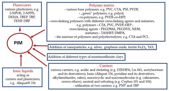 Although various polymeric materials can be used for the formulation of PIMs, only some of them allow for obtaining a membrane with the desired properties, and due to their affordability/ease of synthesis and low costs, do not adversely affect the profitability of the membrane processes. The group of polymers widely used in the fabrication of PIMs includes, among others, polyvinyl chloride (PVC), cellulose triacetate (CTA), polysulfone (PSF) and polyvinylidene fluoride (PVDF). However, in order to improve the efficiency of PIMs, intensive research is also carried out on the possibility of using copolymers and cross-linking polymers for this purpose [35].