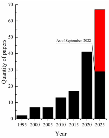 Number of results for “UHMWPE membrane” in quotation marks in Google Scholar. UHMWPE is ultra high molecular weight polyethylene. The horizontal axis represents the years of completion of the five-year interval for calculating the results (1991–1995; 1996–2000; 2001–2005, etc.). The red part shows the expected number of papers by the end of 2025.