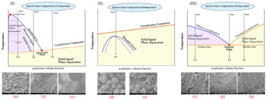 Schematic phase diagrams for the SC polymer mixtures with (I) a poor and (II) a good liquid solvent and (III) eutectic phase diagrams for the SC polymer mixture with a low MW crystalline substance and typical structures formed as a result of the TIPS of the mixtures with different qualitative and quantitative compositions. Subfigures correspond to the typical morphology of capillary-porous bodies formed due to cooling of the homogeneous mixtures by paths (a) A, (b) B, (c) C, (d,e) D, (f) F, (g) G and (h) H. Phase diagrams I and II and the corresponding SEM images were reproduced with permission from Y. Tang, Y. Lin, W. Ma, X. Wang, Journal of Membrane Science; Published by Elsevier, 2021. SEM images (f–h) were reproduced with permission from J. Yoon, Alan. J. Lesser, T.J. McCarthy, MACROMOLECULES, 2009, 42, 8827. Copyright year 2009.