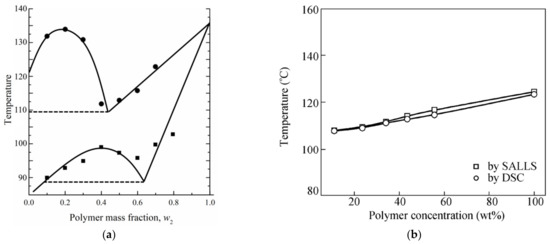 Only two papers [198,230] reported the phase diagram for a mixture of UHMWPE and a low MW substance plotted over the entire range of compositions from 0 to 100%. These phase diagrams are shown in Figure 6.