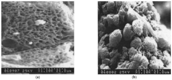 According to the authors of [230], both phase diagrams shown in Figure 6a have a topology of type I, i.e., they contain a liquid equilibrium binodal and a polymer crystallization line located below the binodal. It can be seen that the mass fraction of the polymer at the upper critical solution temperature (UCST) in the phase diagram of UHMWPE with decalin is ca. 40%, which is extremely atypical of polymer mixtures with a low MW substance. Usually, the composition corresponding to the UCST in such mixtures is strongly shifted to the region of compositions enriched by a low MW substance. This allows us to assume that the phase diagram for the UHMWPE mixture with decalin actually belongs to type (II), and all the points (squares in Figure 6a), taking into account the experimental error, correspond to the polymer crystallization line. This point of view is also confirmed by scanning electron microscopy (SEM) images of the structure of capillary-porous bodies published in the same work [230], obtained by cooling mixtures containing 40 wt% polymer (Figure 7). One can see in this figure (Figure 7a) that the porous body obtained from a mixture of UHMWPE with diphenyl ether has a cellular structure resulting from liquid–liquid phase separation followed by polymer crystallization. This type of structure was to be expected, taking into account the topology shown in Figure 6a (see the circles in Figure 6a) and the conclusions made in Section 2.2.1 and Section 2.2.2. At the same time, Figure 7b shows that the porous body obtained from a mixture of UHMWPE with decalin (see the squares in Figure 6a) has a spherulitic structure, which, as shown in Section 2.2.1 and Section 2.2.2, must be the result of so-called solid–liquid decomposition. However, the authors of [39], who did not plot the phase diagram of the respective system, also stated that the UHMWPE–decalin mixture underwent solid–liquid phase separation.