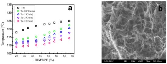(a) Phase diagram for the UHMWPE mixture with LP (the methods used to obtain data are shown in the legend: Tps is the rheological method; Tc is the DSC method at the indicated cooling rates) and (b) SEM image of the cross-section of the membrane prepared through annealing of the UHMWPE mixture with LP containing 25 wt% of the polymer at 115°C and subsequent cooling. Reproduced with permission from S. Liu, C. Zhou, W. Yu, Journal of Membrane Science; Published by Elsevier, 2011.