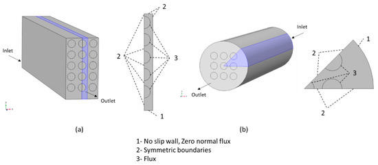 Boundary conditions used in the model: (a) planar bundle; (b) circular bundle.
