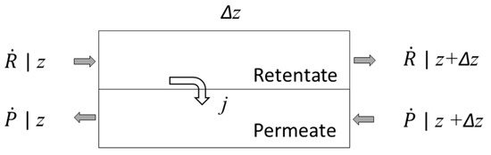 where is the molar flow rate of component in the retentate, is the feed flow rate, is the permeate flow rate, is the active membrane area per unit length, and is the length of the module.