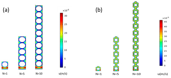 Sample two-dimensional axial velocity distributions for planar bundles with regular square and equilateral triangular configurations in the absence of permeation are shown in Figure 7. Fluid bypass at the fiber bundle–wall interface is evident from the higher velocities.