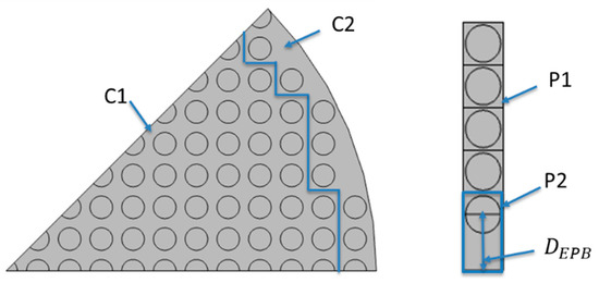 The EPB approximation is illustrated in Figure 10 where the flow domain is divided into two sections: (1) center and (2) wall. The fiber closest to the wall in each horizontal layer is assigned to the wall section and all other fibers to the center. The value for , the distance from the wall to the closed fiber, in the EPB is calculated from Equation (20) and NP1, the number of fibers in the region P1, from Equation (21):