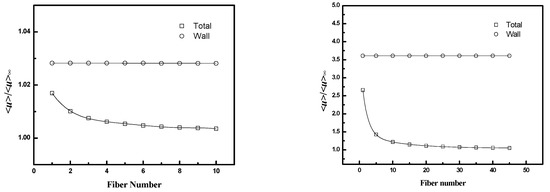 <u>/<u>∞ as a function of fiber number for the whole flow channel (Total) and the channel adjacent to the wall (Wall): (top, left) , D/Rf = 2, (top, right) , D/Rf = 2, and (bottom) , D/Rf = 3.