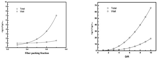 <u>/<u>∞ as a function of fiber packing fraction or D/Rf for square packing; left (D/Rf = 2, and fiber number = 10), right (ϕ = 0.4, and fiber number = 10).