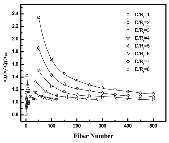 Figure 13 illustrates the effect of fiber number on the results over a broad range of D/Rf values for a packing fraction of 0.4. As for square configuration, the fiber number required for the average velocity ratio to be in the range 1 ± 0.05 increases with D/Rf. The value increases from 10 for D/Rf less than 2 to over 500 for D/Rf greater than 6.