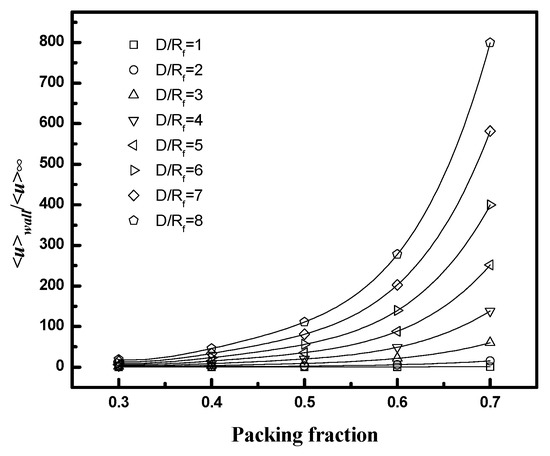 The values for <u>wall/<u>∞ as a function of packing fraction (from 0.3 to 0.7) and D/Rf (from 1 to 8) for an equilateral triangular configuration are illustrated in Figure 14. The values depend weakly on fiber number (results not shown) and increase with either increasing D/Rf or packing fraction due to an increasing relative contribution to the total flow from the wall gap region.