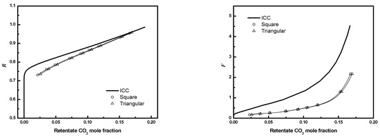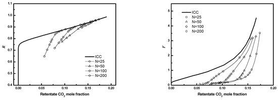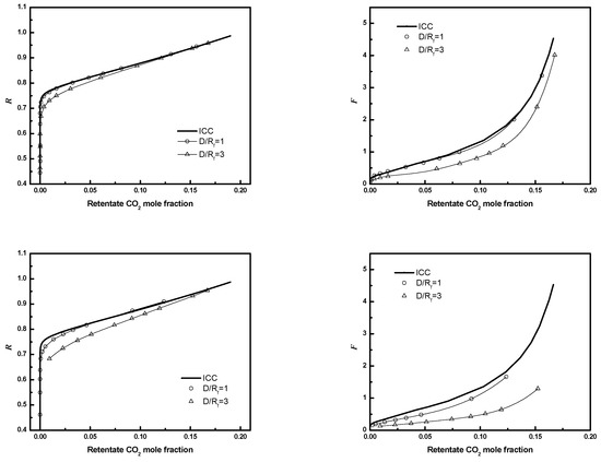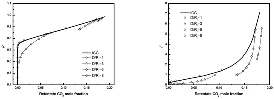 R or F as a function of CO2 mole fraction for module with different D/Rf. Top (N = 405, ), bottom (N = 405, ). Circle, D/Rf = 1; up triangle, D/Rf = 3; solid line, ICC.
