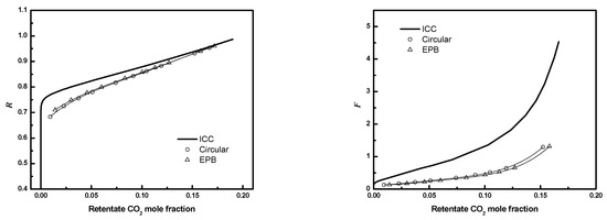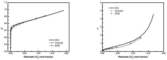 Changes in the dimensionless feed flow rate (F) are more significant than the changes in recovery. For a given retentate CO2 composition, F can decrease by a factor of 10 or more. Such a decrease will necessitate an increase in the membrane area and associated capital costs for treating a fixed feed flow.