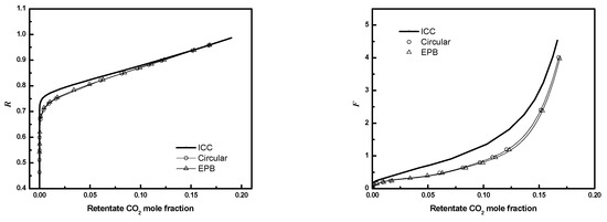 where is the CO2 permeance, is the total surface area and is the absolute feed pressure. R is a measure of the process energy requirements (operating costs) while F is a measure of membrane area (capital costs). The values of both are determined as a function of the CO2 mole fraction in the retentate product. The effect of the wall gap is quantified by comparing module performance to that for an ideal counter-current model corresponding to an infinite, uniformly packed fiber bundle.