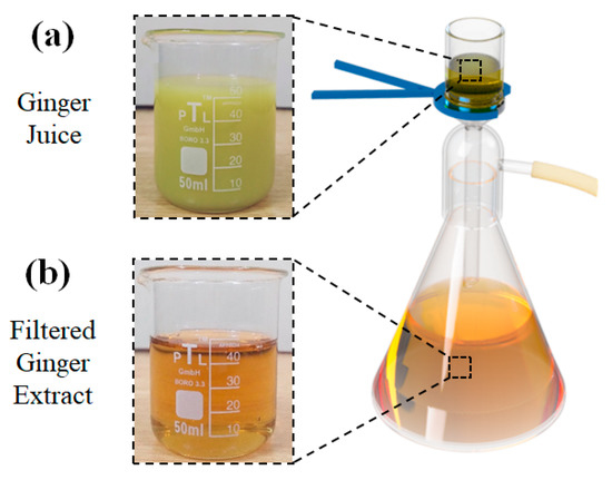 Ginger roots were thoroughly washed and dried at room temperature. After drying, the ginger was peeled and cut into small pieces. Ginger juice was extracted by passing ginger pieces through an electric juicer. Thick ginger juice was obtained, which was further purified using vacuum filtration, as shown in Figure 1. Ginger juice was passed through 0.45 µm and 0.22 µm pore-size filter papers consecutively to separate the coarser particles, and a transparent ginger extract was obtained, as shown in Figure 1b. Several trials were conducted to preserve the GE after filtration, and it was found that after 24 h, the GE slowly started to lose its transparency and became turbid in 2–3 days. GE was preserved at different temperatures, and sonication was used to avoid aggregation. It was observed that GE did not change in appearance and was reusable after sonication for almost a week when kept in an airtight bottle in a cold, dark place. However, the solutions were used within 12 h after filtration.