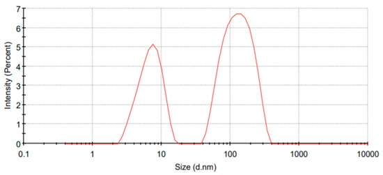 In Figure 3, the size distribution graph of filtered GE indicates that the maximum nanoparticles lie between 5–300 d.nm. Almost 64.6% of particles have an average size of 140.2 d.nm, and 35.4% have 7.265 d.nm. Also, more than 25% of the 64.6% of larger particles have a size of less than 100 nm. These particles can be combined with nanofibres at the nanoscale. Also, the overall average particle size of GE is 91.16 d.nm which indicates its potential incorporation in nanofibres with a diameter greater than 150 nm. Particle size also affects antibacterial activity. Smaller particle sizes enhance the effect because of the large surface area and high rate of reactivity [59]. Although vacuum filtration had only been used as a post-treatment for purification of extracts, the results show it can be independently used as an extraction technique. It is cheap and straightforward, yet an effective and innovative method.