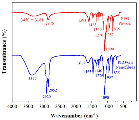 Figure 4 shows the FTIR spectra of PEO powder and PEO5%GE30% nanofibres to examine the functional groups of GE and PEO. The band at 3450 to 3181 cm−1 in the red IR spectrum of PEO powder is due to the O-H stretching vibration. The peaks at 2876 cm−1, 1463 cm−1, and 1345 cm−1 can be assigned to C-H stretching of the methylene group and C-H bending, respectively. The relatively sharp peaks at 1090 cm−1, 957 cm−1, and 835 cm−1 correspond to C-O-C vibration and the asymmetric motion of CH2 [60,61].