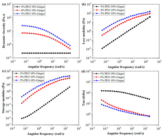 The viscoelastic properties of polymeric solutions depend on chain configuration, molecular weight, concentration, temperature, the nature of the solvent, and shear rate [65,66,67,68]. In this study, the concentration dependent viscoelastic behaviour of PEO/GE solutions was investigated by a frequency sweep test. It also has implications for solution electrospinnabilty and, ultimately, the morphology of nanofibres [69,70]. Figure 5 shows the dynamic viscosity, storage modulus, loss modulus, and tan delta of PEO/GE solutions with varying PEO concentrations while keeping the GE concentration constant at 10%. The viscosity of PEO3% GE10% remains constant as shear rate increases, exhibiting Newtonian behaviour. This trend is because of the low PEO3% GE10% concentration, where viscosity is associated with individual polymer chains. The PEO4% GE10% and PEO5% GE10% viscosities increase significantly with increasing PEO concentration, indicating that enough chains of PEO enable entanglement formation, leading to larger chain structures. This is because of the longer chain structure of PEO (higher molecular weight), which caused chain entanglements even at 4 wt%. Consequently, the viscosity increases exponentially with increasing concentration at 4 and 5 wt%. Both the PEO4% GE10% and PEO5% GE10% curves follow the shear thinning behaviour. In the first quarter, both solutions show a constant decrease in their dynamic viscosity because the chain disruption is low at lower shear rates and coils re-entangle instantaneously. The transition to shear thinning started at a lower frequency in the PEO5% GE10% solution because of higher chain entanglements than in PEO4% GE10%. Then the shear thinning behaviour dominates with increasing shear rates because the rate of chain disruption exceeds the rate of re-coiling.