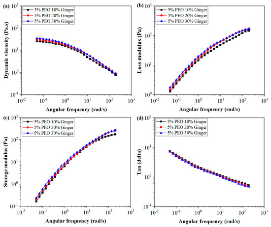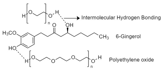 GE concentration can also affect the rheological behaviour of PEO/GE solutions, as rheological properties critically depend on the solvent polymer interactions. Water is a good solvent for PEO due to its higher polarity, and PEO molecules interact favourably with water. Dynamic viscosity, loss modulus, storage modulus, and Tanδ for solutions with a constant PEO concentration (5%) and varying GE concentration (10%, 20%, and 30%) are shown in Figure 6a–d. Increasing the GE concentration on solutions’ viscoelastic behaviour is not as drastic as varying PEO concentrations. However, the dynamic viscosity increases with increasing GE concentration in the solution. This can be explained by the polar interactions between PEO and active compounds of GE like 6-gingerol. Figure 7 shows the schematic diagram of intermolecular hydrogen bonding between PEO and 6-gingerol. Two possible reasons can explain the increasing viscosity behaviour. Firstly, a higher GE concentration might offer more hydrogen bonds to PEO, resulting in resisting flow and a higher viscosity. The second reason might be the larger size of 6-gingerol and other compound molecules in GE than the water molecules, resulting in swelling of the PEO chains with increasing GE concentration and higher viscosity. In addition, all three PEO/GE solutions follow shear thinning behaviour, indicating that the coil dimensions changed similarly for all solutions with varying GE concentrations. The Tanδ curve decreases with increasing GE concentration. These results align with the viscosity response, where more polymer and solvent interactions increase with GE concentration.