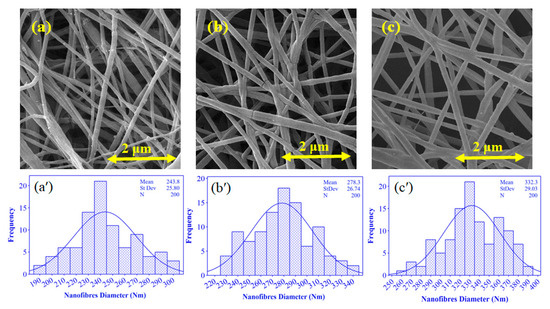 Figure 8. SEM images and histograms of (a,a′) PEO3% GE10%, (b,b′) PEO4% GE10%, and (c,c′) PEO5% GE10%.
