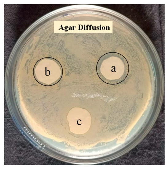 Figure 9. Inhibition zones of (a) PEO5% GE30%, (b) PEO5% GE20%, and (c) PEO5% GE10%.