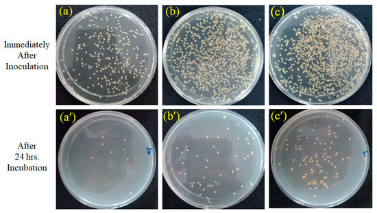 Figure 10. Bacterial colonies immediately after inoculation and after 24 h incubation of (a,a′) PEO5% GE30%, (b,b′) PEO5% GE20%, and (c,c′) PEO5% GE10%.