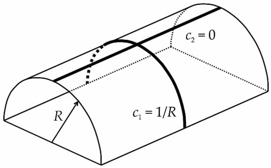 where  is the elastic energy,  is the extrinsic curvature,  is the Gaussian curvature,  is the spontaneous curvature,  is the bending modulus,  is the Gaussian curvature modulus, and  is the surface tension. The first two energy contributions of Equation (1) can be written in terms of principal curvatures: each point at a surface has two normal directions along the tangent plane, at which the curvatures of normal sections (intersections of a surface with planes normal to the tangent plane) obtain maximum and minimum values,  and , called principal curvatures. In terms of , ,  and . These principal curvatures, as well as  and , represent geometrical invariants that do not depend on a surface parametrization. For a cylindrical surface, for example, one of the principal directions is along the cylinder axis, the principal curvature of which equals zero, while the other direction is along the circumference and the corresponding principal curvature equals 1/R, where R is the cylinder radius; see Figure 1. Thus,  = 1/R and .