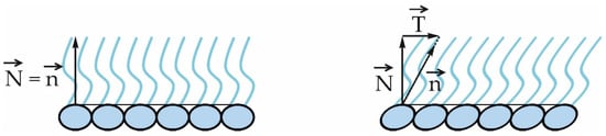 Definition of the vector fields n, N and T. On the left-hand side, the lipid monolayer is in the reference state, and the directions of the normal N to the monolayer and director n, which characterizes the mean orientation of lipid tails, coincide. On the right-hand side, the monolayer is tilted, and the tilt vector T represents the degree of deviation of n from N.