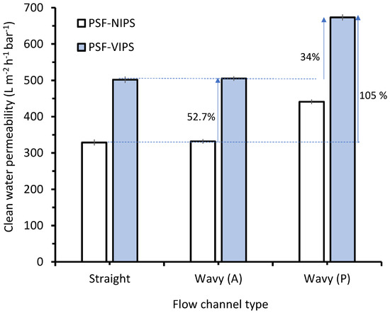 The membrane properties and module configuration can affect the module performance in membrane filtration [34,35]. The term “packing density” is based on the possibility of packing a specific membrane area in a particular module volume. Figure 2 compares the clean water permeability of the two membranes under the flat and wavy flow channels, showing clear advantages of the modified membrane under the wavy flow channel. The CWP of the PSF-NIPS and the PSF-VIPS were 329 ± 8 L m−2 h−1 bar−1 and 502 ± 9 L m−2 h−1 bar−1, respectively, corresponding to a 52.7% increment. When the modified membrane (PSF-VIPS) was evaluated under the wavy flow channel, the permeability was 673 ± 8 L m−2 h−1 bar−1, yielding an advantage of 105% over the PSF-NIPS. The advantage of PSF-VIPS over PSF-NIPS could be attributed to the improved properties of the membranes (Section 3.1) gained from the vapor-induced phase separation fabrication discussed in our earlier work [20].
