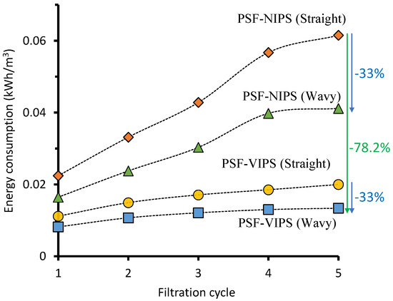 Figure 4 demonstrates the contribution of the wavy flow channel and membrane development in lowering the specific pumping energy during oil/water emulsion filtration. The filtration using the wavy flow channel consumed less energy than the one using the straight flow channel across all filtration cycles. Even for the first filtration cycle, the wavy PSF-NIPS and PSF-VIPS membrane consumed a pumping energy of just 0.016 kWh/m3 and 0.008 kWh m−3, respectively. In contrast, their flat counterparts consumed up to 0.022 kWh m−3 and 0.011 kWh m−3. Those decreases corresponded to a ~27% reduction, which is highly significant, considering the sensitivity of the energy footprint in engineering decisions. The wavy flow channel’s energy-saving gradually increased across the filtration cycles. For the second cycle, an energy-saving of up to ~28% was recorded; this increased to ~30% in the fourth cycle. When comparing the data from the fifth cycle, the energy savings attributed to the wavy flow channel were 33% for both PSF-NIPS and PSF-VIPS. This increasing trend can be attributed to the increasing influence of the hydrodynamics in limiting the filtration resistance caused by the boundary layer. The wavy membranes made the boundary layer thinner thanks to the fluid eddies induced by the swirling flow patterns, as demonstrated earlier by the fluid dynamics simulation [30].