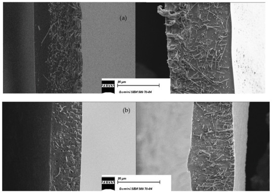 The produced fibers can be subsequently added to the polymer matrix as reinforcement by casting, allowing for the ionomeric membrane to be stabilized [22]. The reinforcement creates a net retaining of macromolecules between its meshes when the membrane is hydrated. This hydrolytic stabilization is often accompanied by an improvement in the mechanical properties [14,15,23,24,25].
