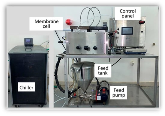 Experiments were carried out using a Sterlitech Co. (Auburn, Al, USA) SEPA CF042 Membrane Test Skid, presented in Figure 1 with the scheme for the crossflow filtration ROM processes. A Dow Polyamide TFC BW30XFR flat sheet membrane was utilized under an acidity range of 2–11 and 100 Da MWCO with a 140 cm2 membrane area.