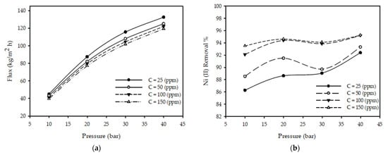 Effect of pressure on (a) permeate flux and (b) Ni (II) removal % under alternating feed concentrations with a fixed inlet feed flow rate of 3.2 L/min and a feed temperature of 25 °C.