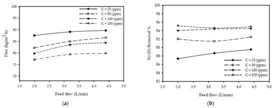 Feed concentration impact on (a) permeate flux and (b) Ni (II) removal % for feed flow rates with a constant pressure of 20 bar and a temperature of 45 °C.