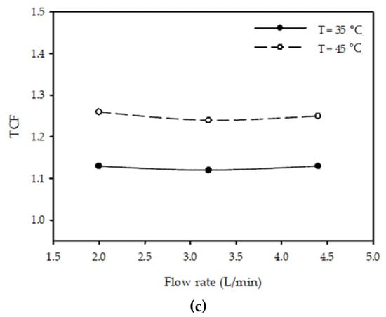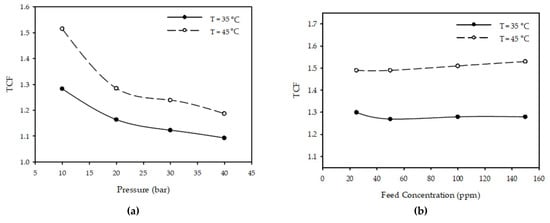 Figure 6a demonstrates the changes noted to the TCF by altering the operating temperatures of the process while maintaining a constant flow rate at 3.2 L/min with a 100 ppm feed concentration. The results revealed that increasing the pressure from 10 to 40 bar caused a reduction in the TCF values by 17% from 1.28 to 1.09 for a temperature of 35 °C, and a further reduction from 1.52 to 1.19 (around 28%) when the temperature rose to 45 °C.