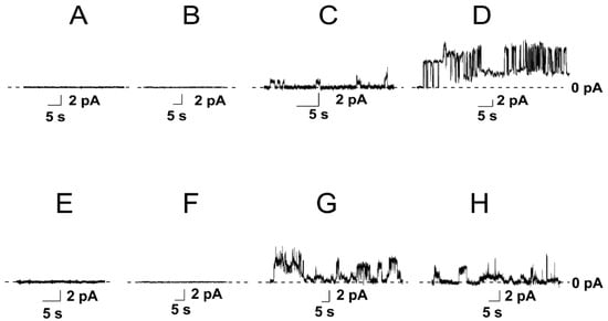 Examples of nisin-induced step-like current fluctuations through the membranes of different composition. The bilayers were composed of DOPC (A), DOPC/DOPS (50/50 mol%) (B), DOPC/DOPG (50/50 mol%) (C), DOPC/TOCL (50/50 mol%) (D), DOPE (E), DOPE/DOPS (50/50 mol%) (F), DOPE/DOPG (50/50 mol%) (G), and DOPE/TOCL (50/50 mol%) (H) and bathed in 0.1 M KCl, pH 7.4. The concentration of lantibiotics in bathing solution was equal to 2000 (A), 700 (B), 5 (C), 10 (D), 2000 (E), 600 (F), 60 (G), and 10 µM (H). V = 100 mV.